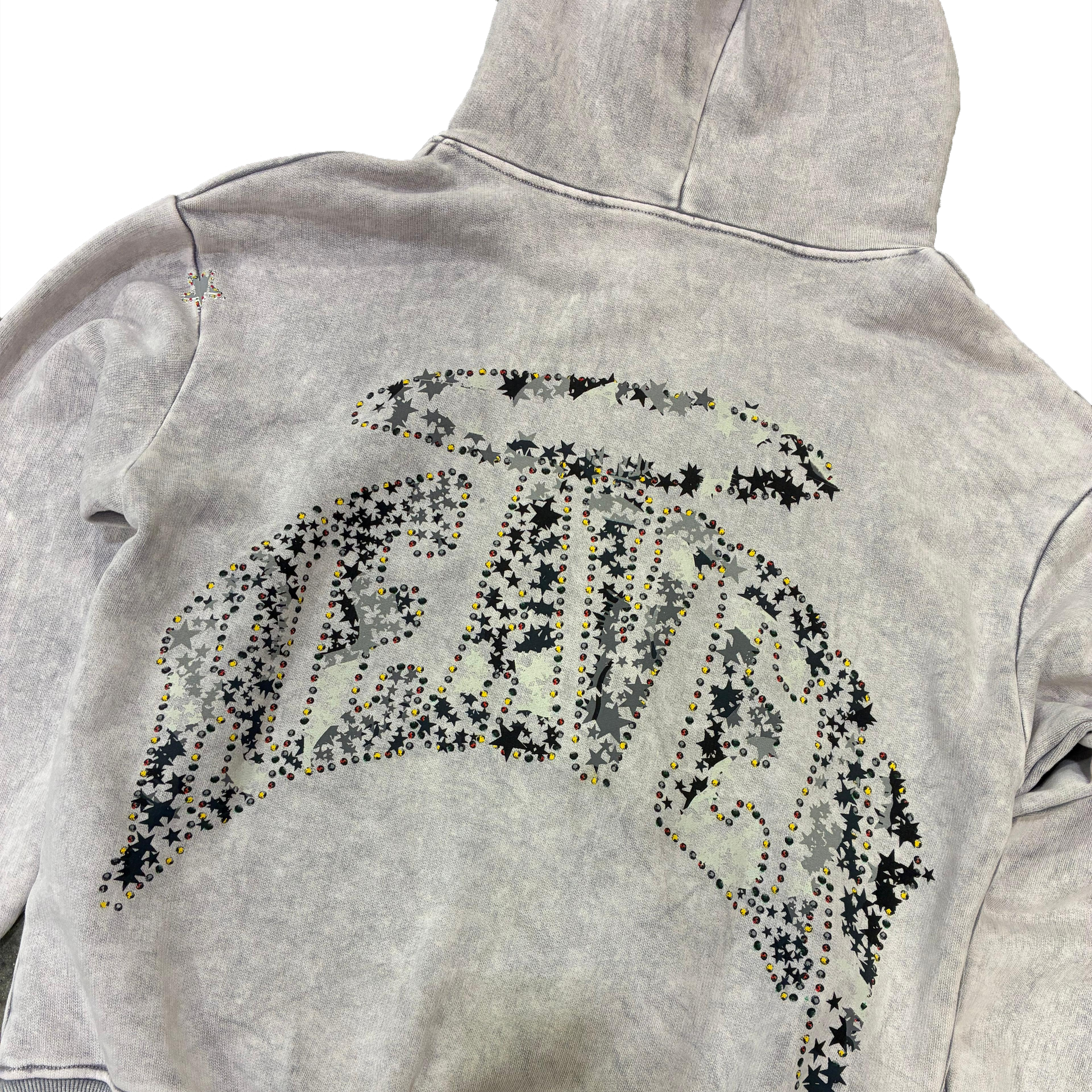 100% Cotton Garment Dyed hoodie with Virgen de Guadalupe & Heaven Arc Logo screen printed graphic.
